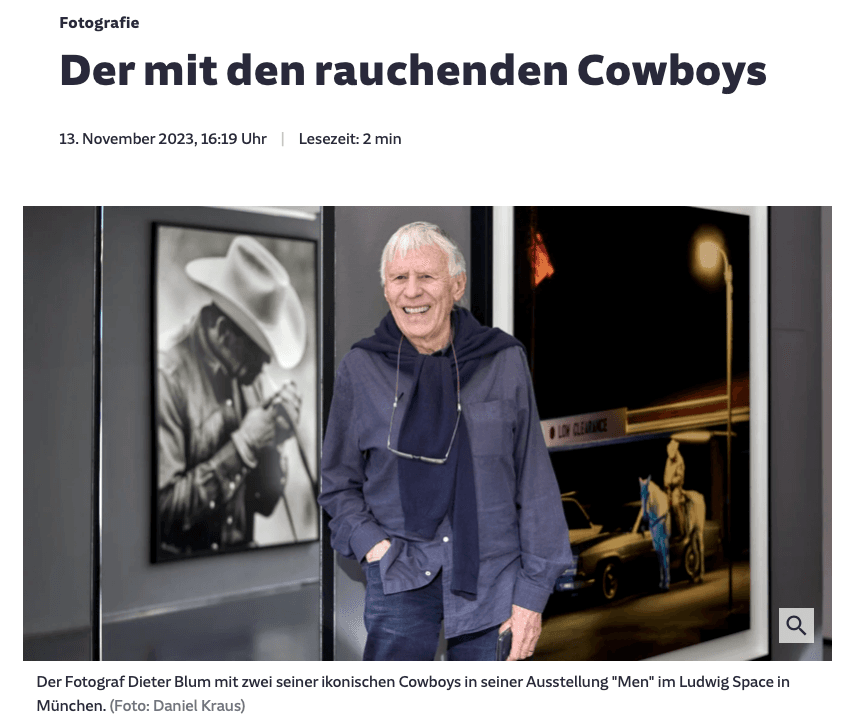 Helikopter, um für ein Fotoshooting über die Weiten der amerikanischen Steppe zu fliegen? Kein Problem. Drohnen, um den Kreml von oben zu fotografieren? Durchaus ein Problem. Aber keines, vor dem Dieter Blum kapituliert hätte. (...) Er sagt,,,ich hab' immer alles gekriegt, was ich wollte". (...) Er hat Herbert von Karajan und die Berliner Philharmoniker ebenso porträtiert wie Gerhard Schröder und Karlheinz Böhm. Sein Credo:,,Die Menschen haben mich immer interessiert." Aber auch die Kraft und Schönheit des Körpers fasziniert ihn seit je her. Und so hat er die Grazie des Moskauer Bolschoi-Theaters und den Zauber des Stuttgarter Staatsballetts in fantastischen Körperbildern festgehalten. Er hat (...) den unvergesslichen Ismael Ivo als Francis Bacon fotografiert und Jiri Jelinek in seinem Studio dazu gebracht, waghalsige Sprünge jenseits jeder Schwerkraft zu wagen. (...) So unterschiedlich die Motive von den Cowboys über die Musiker, Politiker bis hin zu den Tänzern sind, so sind es doch verschiedene Facetten von Männlichkeit. Und so heißt die Ausstellung in München schlicht "Men".