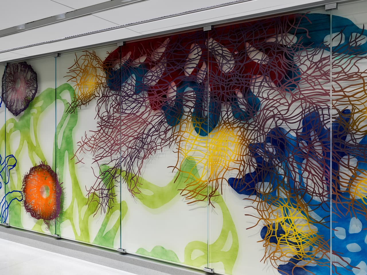 Nnenna Okore drew on biologic and ecologic forms, in order to develop an ætiology of things, embodying a site for generative thinking and artful experience for viewers and users. Metaphorically, the art piece is a visual stage upon which familiar elements spark conversations, inquiries, or understandings of our shared experiences with the delicate, transient, amorphous, and ever-changing attributes of the planet. The artist writes: The invitation to infuse art into the vast wall space of this medical facility inspired me to consider how the fields of knowledge between sciences and arts are connected, re-imagined, and blurred. Put differently, my vision for this design is to activate a space that inspires and energizes, while suspending the fences between the art and science, in a manner that enlivens compelling visual experiences and provocations driven by the sense of wonder in how and why things come to exist and matter. I hope that "an ætiology of things" evokes a curiosity that goes beyond the usual spheres of reference to engender conversations around the complex visual intricacies, artistic language, learning, and metaphoric/scientific interpretations of things.