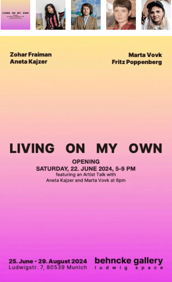 The group exhibition "Living on my own", which opens the following day, revolves around the perception of our identity, which is constantly being challenged by new types of media and artificial intelligence. Below you can get a brief insight into the work of the four international artists living in Berlin (Zohar Fraiman in addition to the three mentioned).